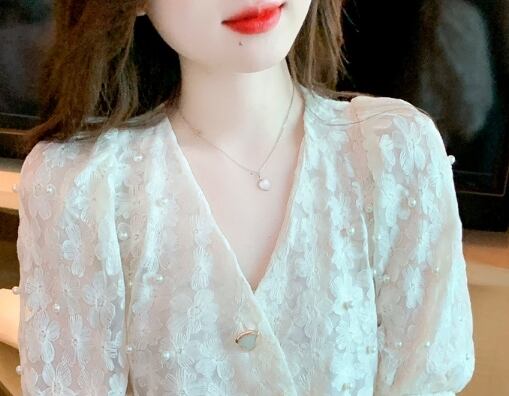 トップス シャツ 50164 半袖 Vネック かわいい ガーリー キュート きれいめ おしゃれ お洒落 夏 20代 30代 休日 お出かけ イベント S M L XL 白 アプリコット 送料無料