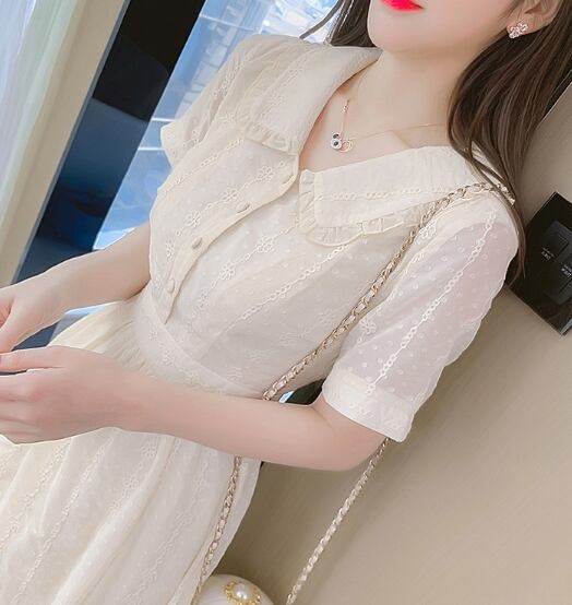 華やかな刺繍や襟、ボタンのディテールが清潔感を演出し、