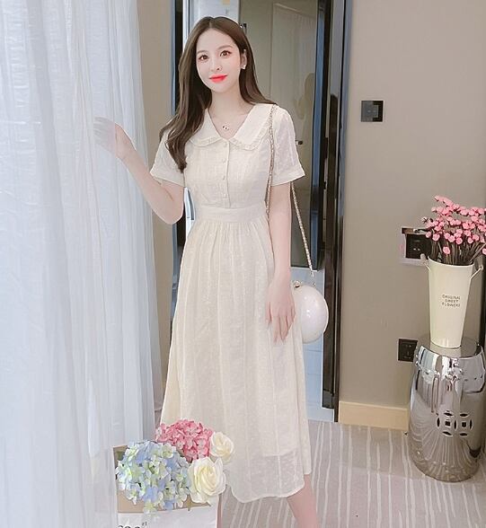 ワンピース ロング丈 レディース Vネック 50177 半袖 刺繍 襟 ボタン 大人可愛い 上品 清潔感 おしゃれ お洒落 Aライン ガーリー キュート アプリコット 主役級 存在感 フェミニン 春 夏 秋 20代 30代 デート 休日 お出かけ イベント 普段使い 女子会 S M L XL アプリコット 送料無料