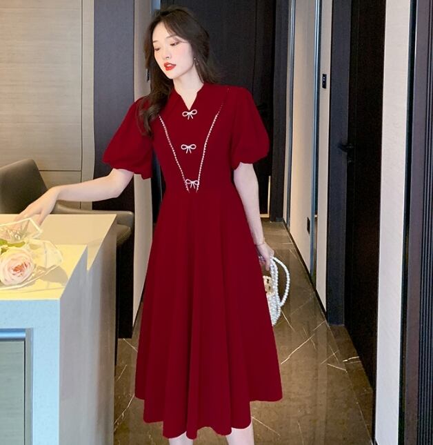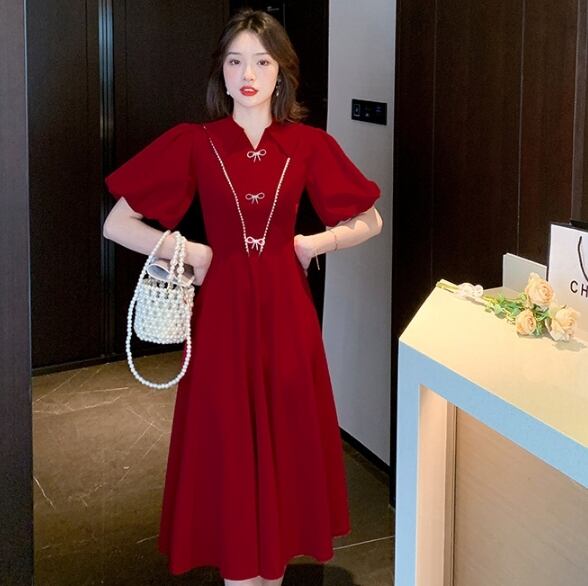ワンピドレス ロング丈 半袖 Vネック 大人女子 レトロ 上品 きれいめ レトロ シンプル かっこいい 大人可愛い ママコーデ ママファッション 無地 レッド 春 夏 秋 20代 30代 40代 パーティー イベント 女子会 普段着 ラフ カジュアル フェミニン シック S M L XL 2XL 送料無料 50301
