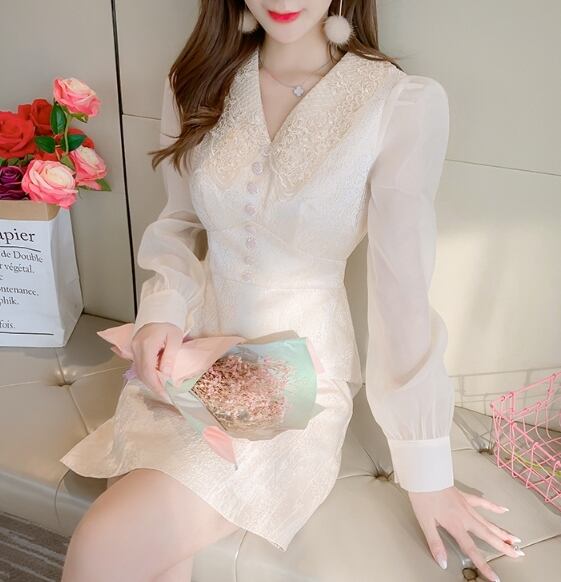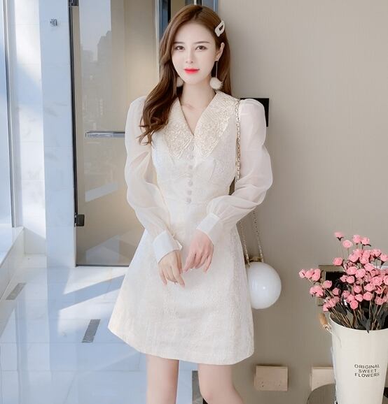 ワンピース レディース 膝上 50262 長袖 Aライン Vネック レース シフォン ポリエステル 上品 きれいめ 清潔感 おしゃれ エレガント シンプル 春 夏 秋 10代 20代 30代 レディース 女性用 ビジネス OL 通勤 普段使い 定番 S M L XL 韓国系 インスタ映え 送料無料