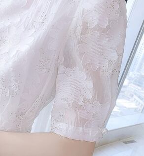 膝上丈とAラインのシルエットが女性らしさを引き立て、軽やかなシフォン素材が涼しげな印象を与えます。
