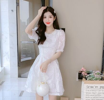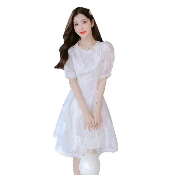 ワンピース レディース ドレス 膝上 花柄 50265 半袖 ラウンドネック パール飾り Aライン シフォン レース ポリエステル シンプル レトロ 大人可愛い おしゃれ 清潔感 ラブリー ママコーデ 夏 10代 20代 30代 普段使い 通勤 休日 デート 定番 S M L XL 韓国系 インスタ映え 送料無料