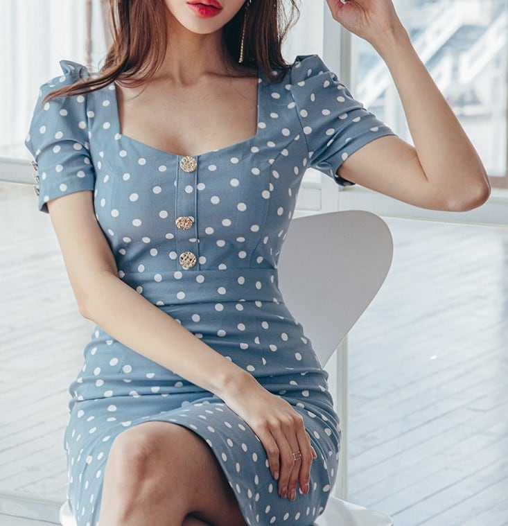 送料無料 ワンピース レディース ひざ丈 半袖 スクエアネック シンプル カッコイイ キュート プリティ 細身 おしゃれ かわいい ドット柄 夏 10代 20代 30代 40代 イベント きれいめ レトロ お出かけ デート S M L XL 水色 個性的 クール セクシー 露出 インスタ映え 50581