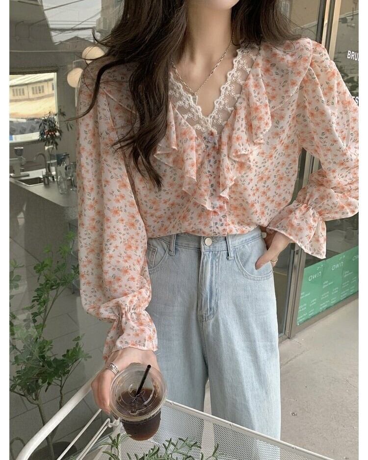 首元シアーレース ラッフルフリル フローラル トップス 10208 ブラウス ミディアム丈 長袖 キャンディスリーブ ボリューム袖 襟なし Vネック 切り替えデザイン フロントボタン 前開き 透け感 シースルー 異素材MIX かわいい 大人可愛い シンプル カジュアル きれいめ 上品 おしゃれ キュート ガーリー 甘め 春 夏 花柄 フラワープリント レディース ママ 女の子 学生 通学 デート お出かけ 休日 普段使い 韓国風 オルチャン 体系カバー ワンサイズ ゆったり ライトオレンジ ライトイエロー
