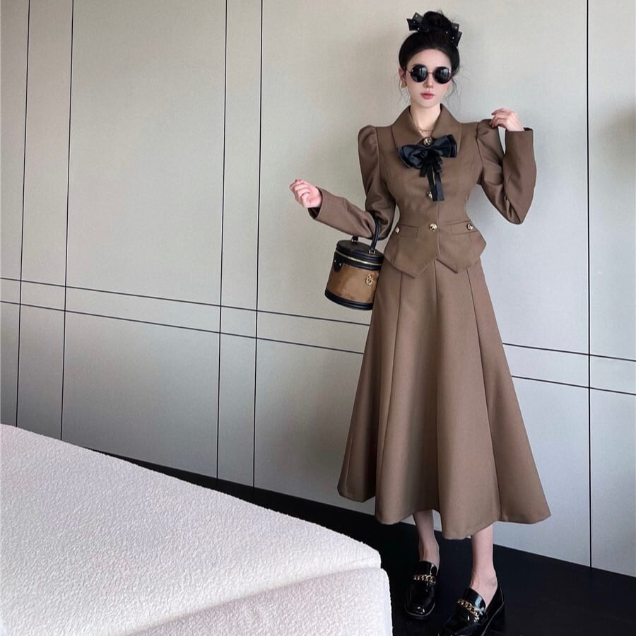トップス スカート セットアップ 3223 ジャケット ロングスカート フレアスカート 長袖 Vネック 襟付き Aライン リボン ハイウエスト 上下セット 2点セット かわいい 大人可愛い きれいめ 大人 上品 おしゃれ お洒落 レトロ 大人可愛い 大人女子 ラブリー キュート ガーリー エレガント 主役級 存在感 抜け感 無地 10代 20代 30代 レディース 女性用 デート お出かけ 女子会 パーティー イベント ホテル レストラン 着回し モテ S M L ブラック ブラウン 送料無料