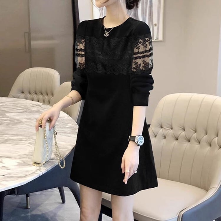 透けレース切替え 肌見せ ワンピドレス サックワンピ 10242 ワンピース 膝上 ミニ丈 ミディアム丈 Aライン 長袖 襟なし クルーネック 切り替えデザイン 透け感 袖シースルー 異素材MIX かわいい 大人可愛い シンプル カジュアル きれいめ 上品 おしゃれ お洒落 エレガント シック 春 秋 無地 レディース 女性用 ママ 女の子 学生 通学 デート お出かけ 休日 お呼ばれ 会食 お食事会 韓国風 オルチャン ファッション コーデ スタイル 体系カバー S M L XL ブラック モノトーン