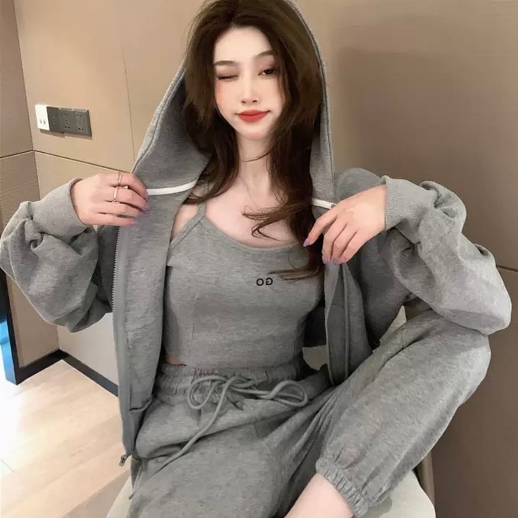 3点セット トレンド セットアップ キャミ付き 10376 ストリート キャミソール ショートキャミ パーカー トレーナー トップス ボトムス パンツ ルームウェア パジャマ ベスト フーディー ズボン スウェット ナイトウェア ストレートパンツ 袖あり 長袖 ストレート フード付き スター 星 上下セット シンプル カジュアル 大人 かっこいい 無地 春 夏 秋 冬 お出かけ 公園デビュー お泊まり 休日 重ね着 韓国 オルチャン 楽ちん スポーティー 運動 ジム S M L XL グレー 送料無料