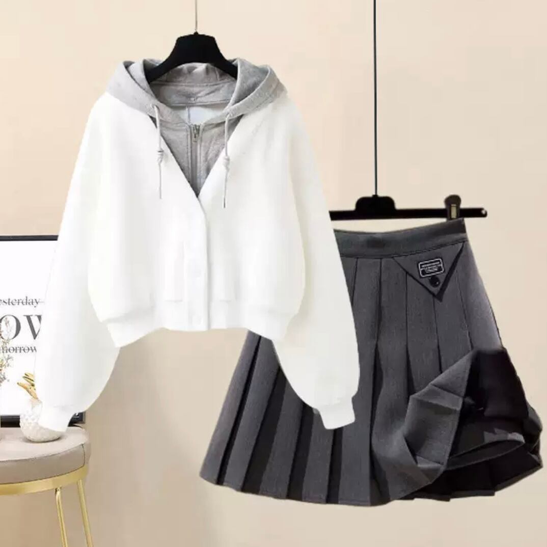 2点セット セットアップ フェイクレイヤード 10378 ルームウェア トップス インナー付き スカート パーカー トレーナー フーディー ミニスカート プリーツスカート タックスカート ミニ ミニ丈 ショート ショート丈 袖あり 長袖 萌袖 切り替えデザイン フード付き ファスナー ジッパー 上下セット ツーピース 大人可愛い シンプル カジュアル 上品 かっこいい スポーティー クール 無地 春 秋 冬 お揃い 双子 韓国 オルチャン M L XL 2XL 3XL 4XL 大きいサイズ 送料無料