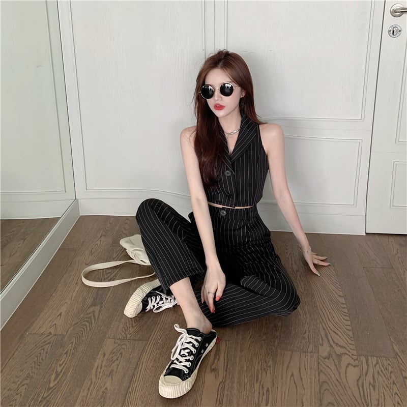 2点セット クロップドジャケット パンツスーツ セットアップ 11037 アウター ショート丈 袖なし ノースリーブ 襟付き 細身 スマート フロントボタン ボトムス パンツ スラックス アンクル丈 ロング丈 ハイウエスト ベルト通し付き シンプル カジュアル きれいめ おしゃれ 大人っぽい かっこいい クール スタイリッシュ 春 夏 ピンストライプ柄 シマ 縦縞 レディース ママ 女の子 学生 通学 デート お出かけ 休日 普段使い 着回し 韓国風 オルチャン 脚長 S M L 黒 ブラック モノトーン