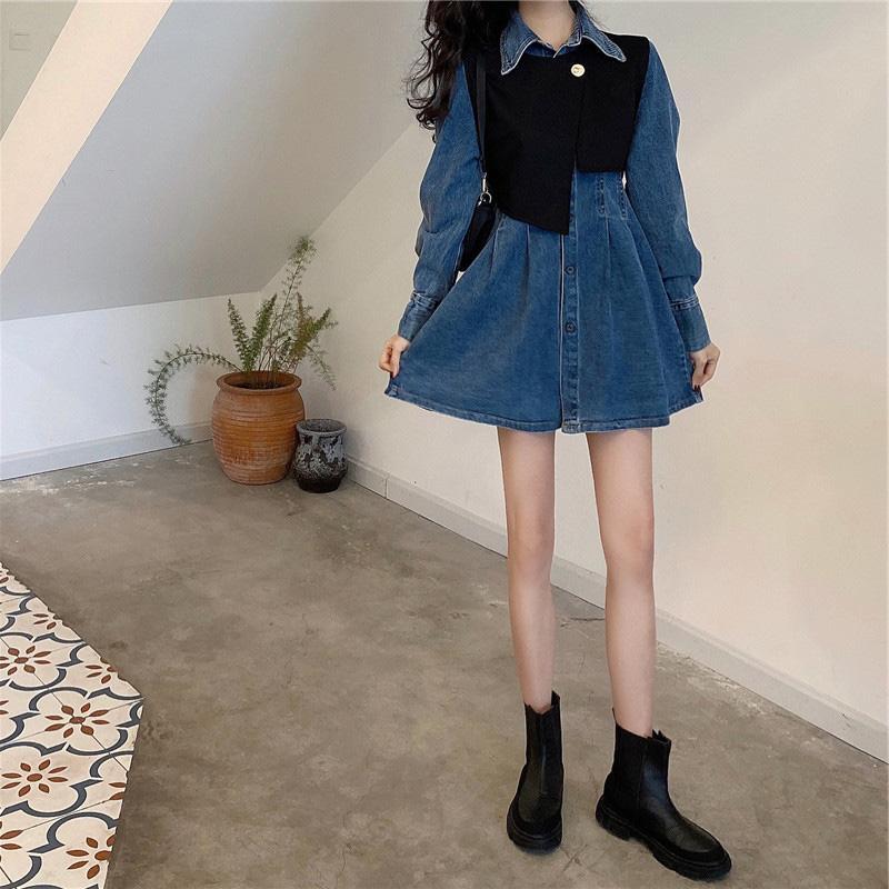 ワンピース ベスト デニムワンピース ショート丈 10136 長袖 レギュラー袖 襟付き ポロカラー 前開き ポリエステル デニム 2点セット 大人可愛い カジュアル お洒落 こなれ感 ラフ ラブリー キュート 個性的 セクシー 抜け感 無地 春 秋 10代 20代 レディース 通勤 学生 通学 デート お出かけ 女子会 お泊まり 休日 リゾート 旅行 高原 ホテル ガーデン 外国風 重ね着 韓国系 オルチャン コーデ スタイル モテ 美脚 脚長 ギフト インスタ映え S M L XL 黒 青 送料無料