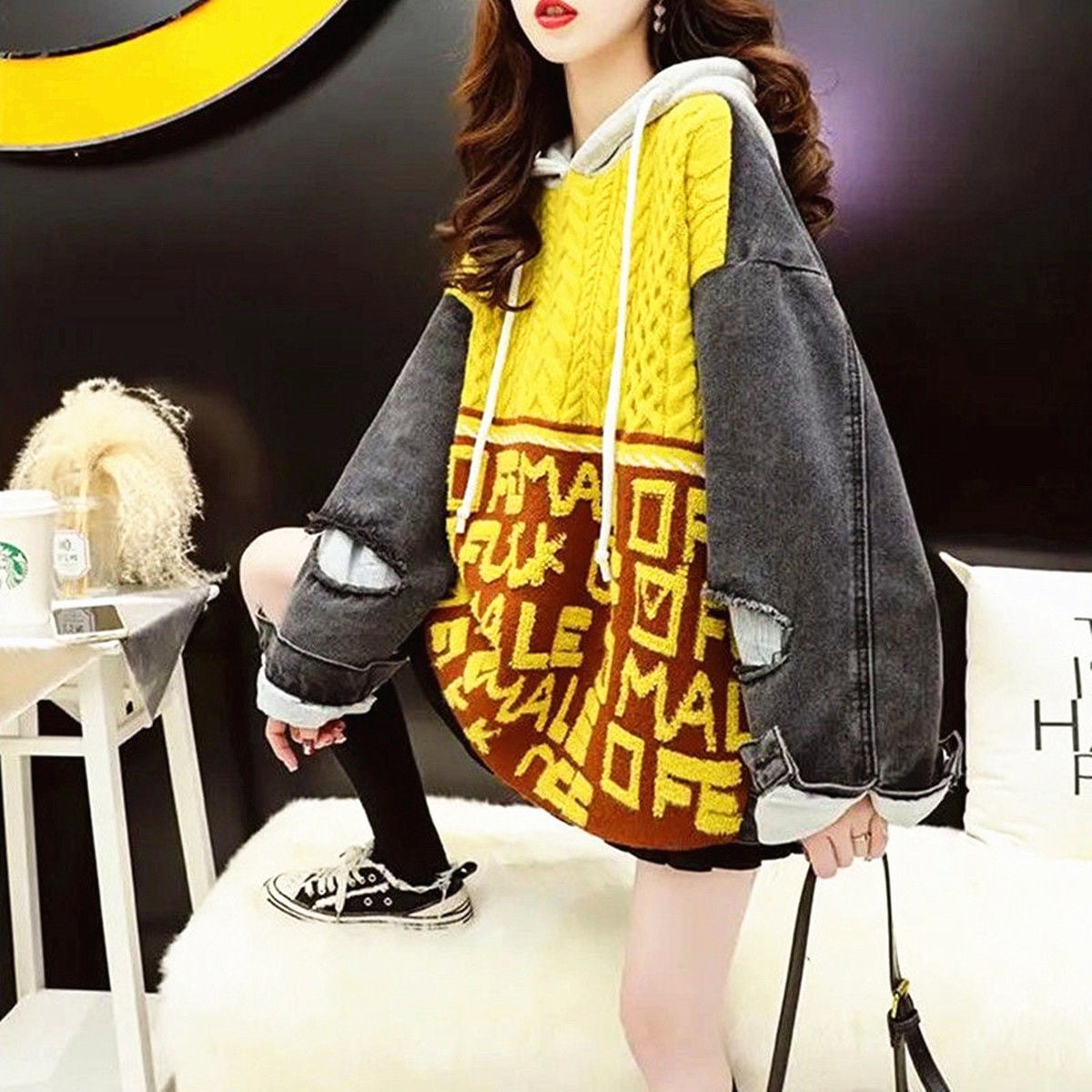 トップス ジャケット プルオーバー 10141 レギュラー丈 長袖 レギュラー袖 刺繍 フード付き 綿 デニム ニット ウール 厚手 フェイクツーピース お洒落 ラフ キュート ルーズ 存在感 甘い 柄 アルファベット ステッチ 春 秋 誕生日 10代 20代 女性 通勤 学生 通学 デート お出かけ 女子会 休日 アウトドア イベント 旅行 高原 ショッピング 韓国系 オルチャン 楽ちん 暖かい ダメージ 穴あき ギフト インスタ映え ヨーロッパ風 S M L XL 2XL 3XL 青 黄色 送料無料