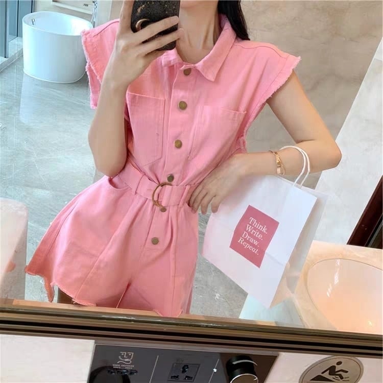 オールインワン サロペット ショートパンツ ショート丈 袖なし ノースリーブ 10920 襟付き スリム 細身 ベルト ポケット ハイウエスト 前開き デニム 大人可愛い きれいめ シンプル カジュアル 大人 上品 お洒落 かっこいい レトロ 大人女子 こなれ感 とろみ感 抜け感 無地 夏 10代 20代 30代 レディース デート お出かけ 女子会 お泊まり 休日 旅行 ショッピング 普段使い 韓国 オルチャン ファッション コーデ スタイル トレンド 流行 S M L XL グリーン ピンク 送料無料
