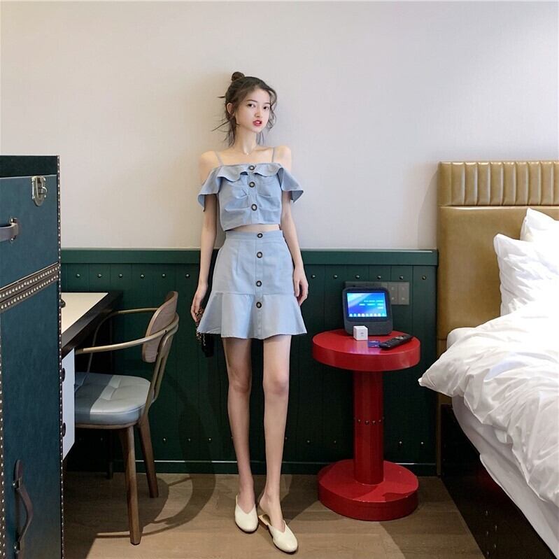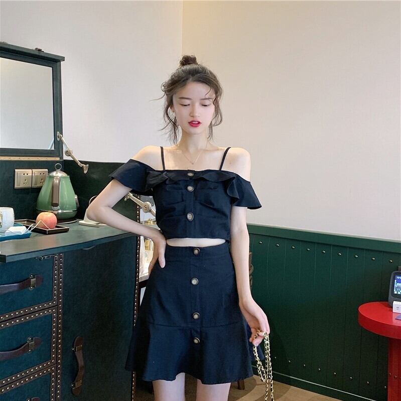 2点セット ストラップ付き クロップドオフショルトップス フリルヘムスカート 10961 セットアップ トップス ブラウス ショート丈 フリルポイント 肩紐付き オフショルダー 肩見せ 鎖骨見せ 胸元ギャザー ボトムス スカート マーメイド 膝上 ミニ丈 マイクロミニ 裾フリル切り替え フロントボタン かわいい 大人可愛い シンプル カジュアル おしゃれ お洒落 セクシー 肌見せ 無地 夏 レディース 女の子 デート お出かけ 旅行 リゾート 休日 普段使い 脚長 S M L XL ブラック スカイブルー