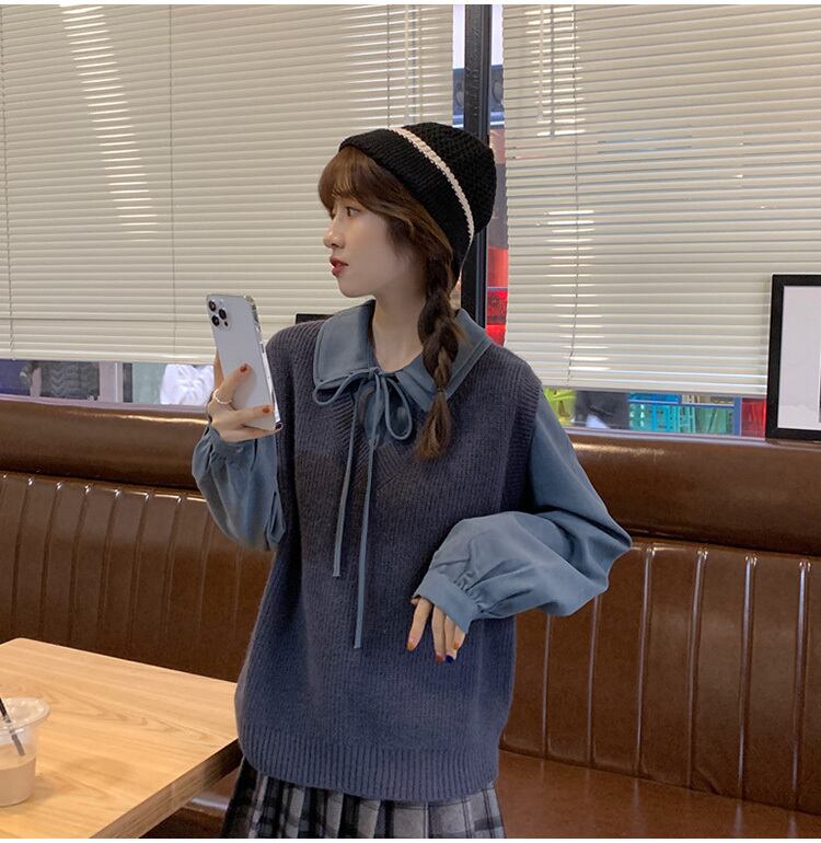 トップス シャツ ベスト レギュラー丈 袖あり 長袖 4212 襟付き ポロカラー スリム 細身 ストレート リボン 前開き プルオーバー 2点セット 大人可愛い きれいめ シンプル カジュアル 大人 上品 お洒落 かっこいい レトロ 大人女子 こなれ感 存在感 とろみ感 抜け感 無地 秋 10代 20代 30代 レディース デート お出かけ 女子会 お泊まり 休日 旅行 着回し 普段使い 重ね着 韓国系 オルチャン コーデ スタイル モテ トレンド 流行 ワンサイズ ブルー ブラウン ピンク 送料無料