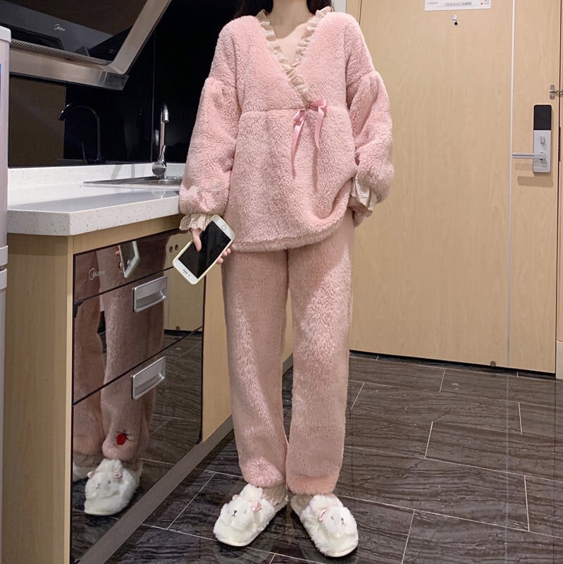 ルームウェア パジャマ 部屋着 寝巻き 3173 ナイトウェア パジャマセット フリースパジャマ Vネック 袖あり 長袖 襟なし フリル リボン もこもこ モコモコ ふわふわ ボア 上下セット 2点セット セットアップ お得 かわいい おしゃれ お洒落 大人可愛い ラブリー キュート モテ 暖かい 無地 春 秋 冬 10代 20代 レディース 女性用 女の子 女子会 お泊まり 普段使い プレゼント ギフト ファッション コーデ 楽ちん サイズ フリーサイズ ゆったり ゆる 色展開 ピンク 送料無料