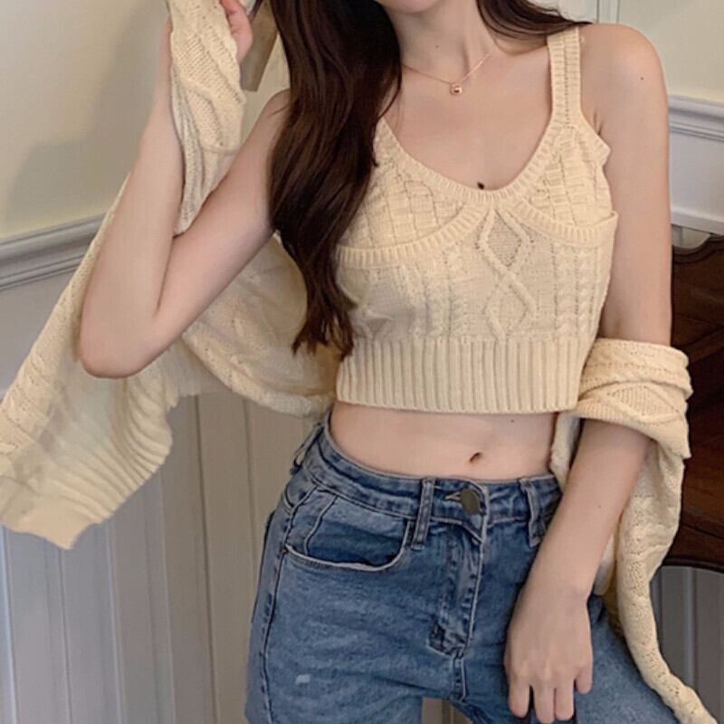 ▪このセットアップは、クロップド丈のカーディガンとニットベストの2点セット。ショート丈デザインで、きれいめからカジュアルまで幅広いスタイルに合わせられます。Vネックのきれいめなタンクトップとも相性抜群です。