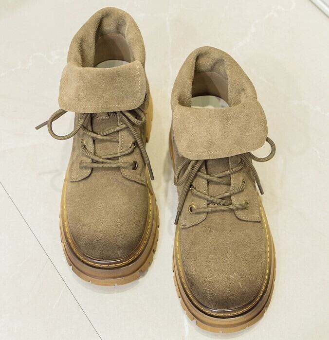 ■2ウェイデザインのヌバックレザーがおしゃれな、厚底ワークブーツのご紹介です。4.5cmのヒールで、脚長効果も抜群。従来のワークブーツより、ラウンドトゥで足先もゆとりがあるので、長時間の歩行でも疲れにくいんです。しかも、後ろに通す紐は取り外しも可能で、ファッションアクセントになるだけでなく、調節しやすくなっています。