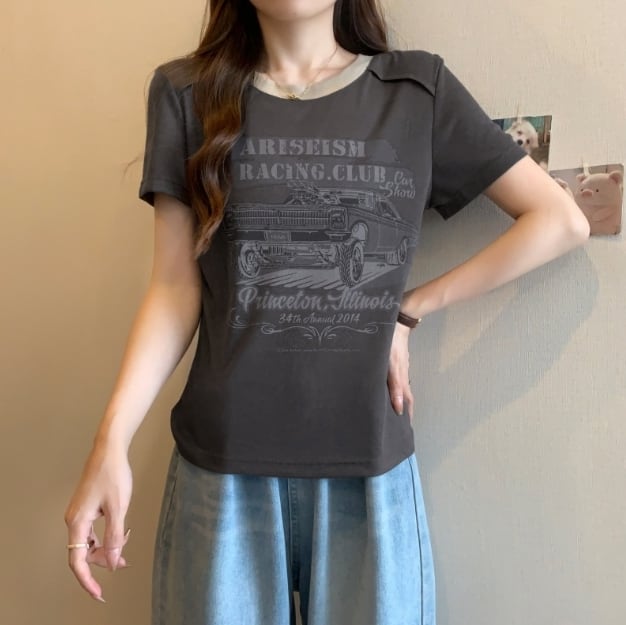 【送料無料】 トップス Tシャツ 半袖 カジュアル アメリカン レトロ 夏 カーキ グレー 10代 20代 30代 レディース N1052