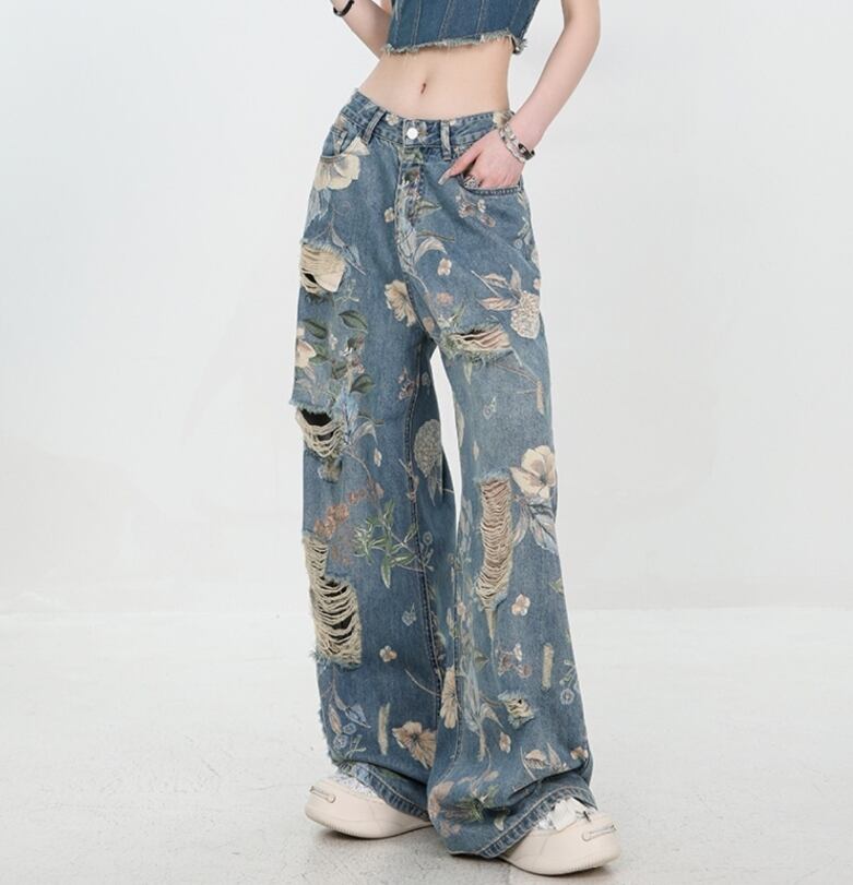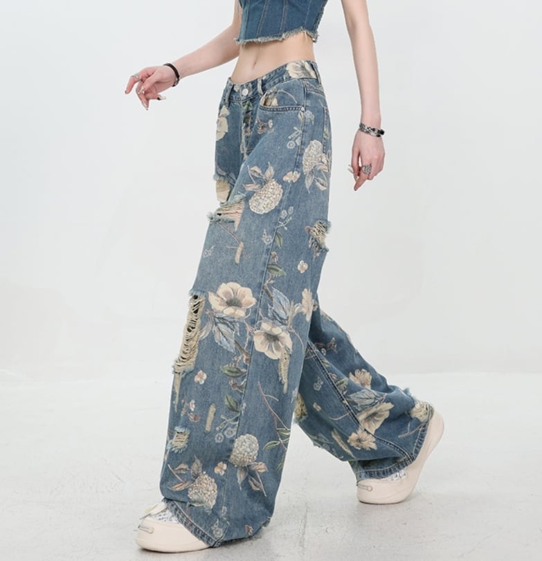 【送料無料】 パンツ ジーンズ デニム ワイドパンツ ロングパンツ 植物柄 大人可愛い 大きいサイズ おしゃれ シンプル きれいめ カジュアル フェミニン シック 人気 秋 春 冬 10代 20代 30代 40代 お出かけ デイリー 普段着 ママ 着回し OL 学生 通勤 通学 フォト インスタ映え 70158